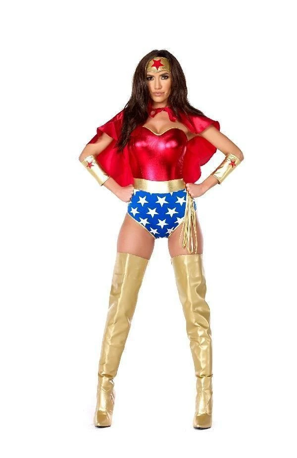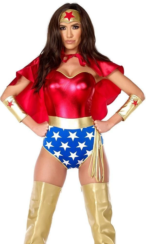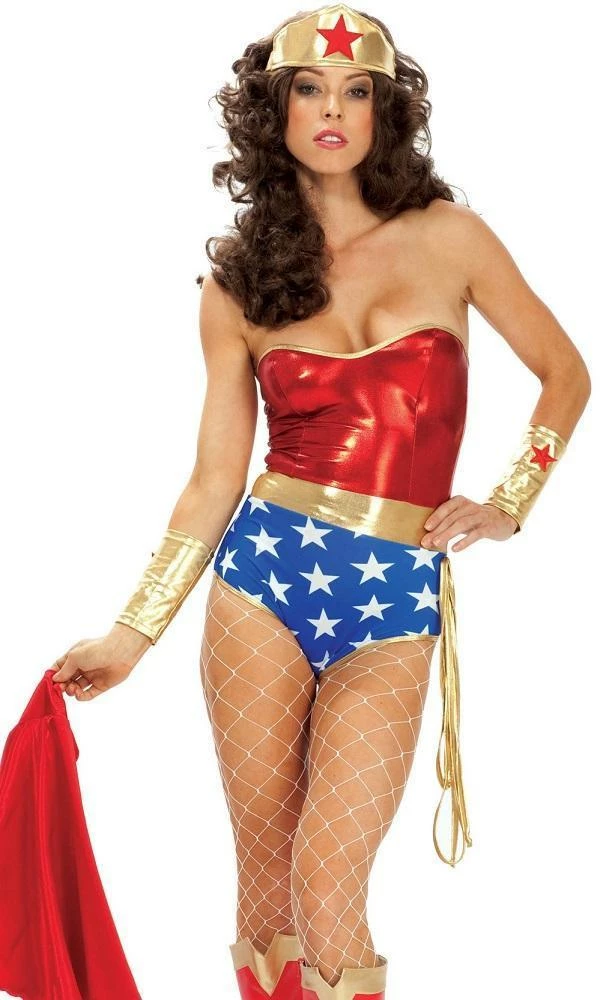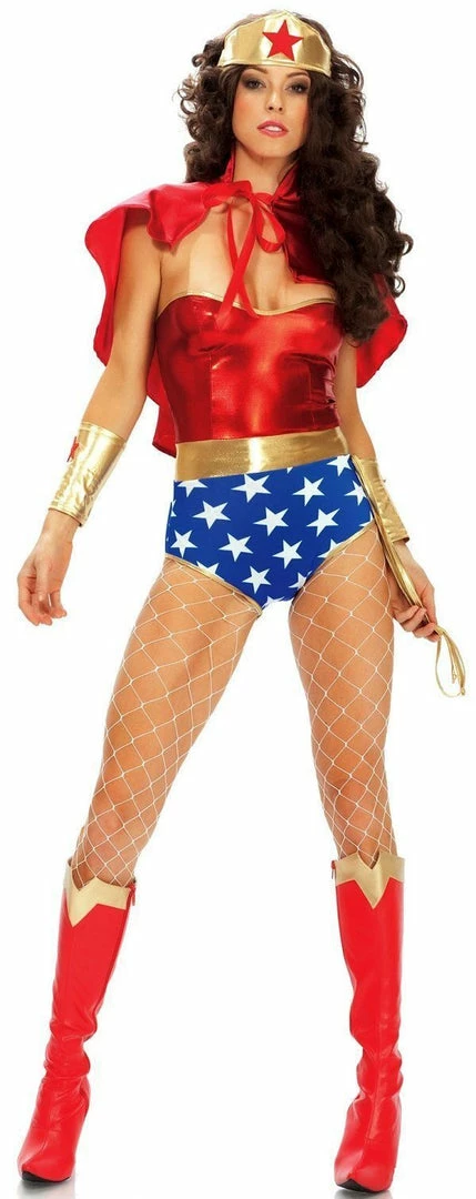 Super Seductress inspired super hero fancy dress costume by Forplay costumes USA. This costume features a strapless metallic bodysuit with star spangled bottom half, matching cape, headband, arm cuffs and laso.