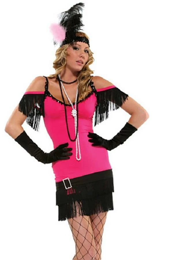 This Fierce Flapper costume includes a pretty pink fringed dress, matching 1920’s style feathered headpiece and gloves.