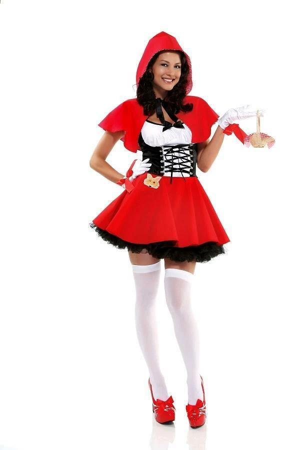This sexy Hollywood version of the Little Red Riding Hood costume features a sexy lace up bodice dress, red hooded cape, basket and gloves.