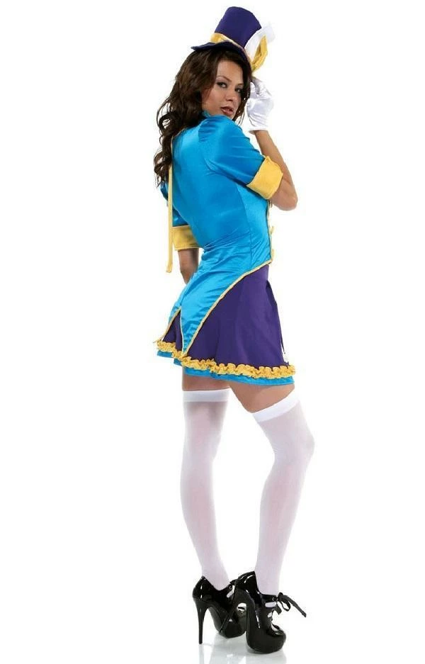 Mad Hatter costume, a fun, unique take on the Mad Hatter character, from the famous Alice in Wonderland fairy-tale. Features a bright blue top with a tails jacket style, short sleeves, yellow trim and button details. A purple skirt with blue hemline, yellow ruffle trim and tea cup print.