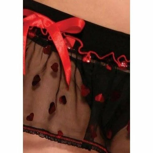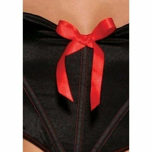 Heart shaped structured corset crop top with sequined skirt and thong. Captivating bustier top in the shape of a heart and with internal boning for added support. Translucent mesh back panel with adjustable tied bow, classy red ribbon satin bows. Comfortable elastic waistband with red tipped ruffles and a G-string side panty completes the look.