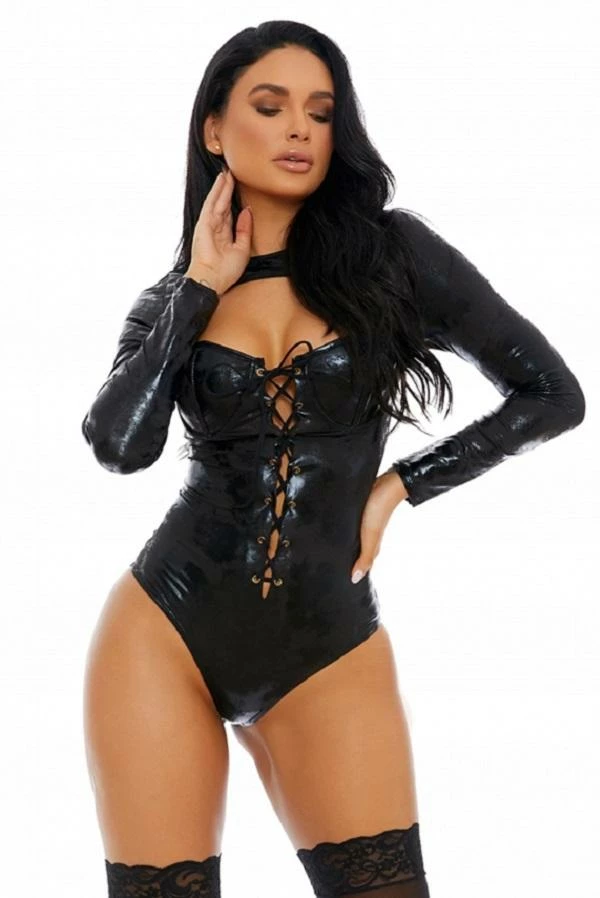 “Distress” teddy featuring long sleeves, high neck, open panel, distressed vegan leather, lace-up grommet detail, moulded cups and zip back closure.