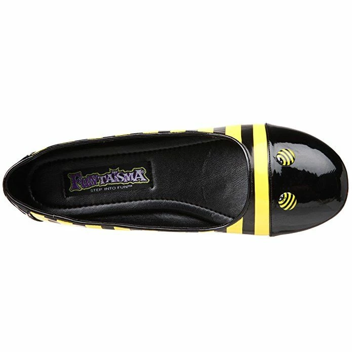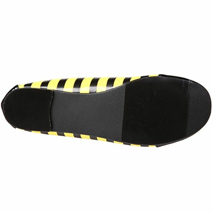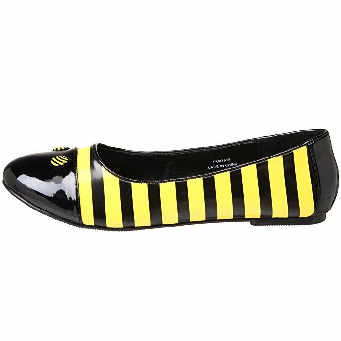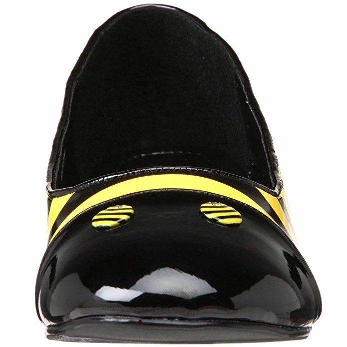 Black and yellow patent bee inspired fancy dress costume shoes. Highlight your attire with these unique bee fancy dress flat shoes by Pleaser. These flats are made with black and yellow patent on the exterior, finished with a round toe and eye-ball button accents and are ideal to complete all your bee style fancy dress costumes