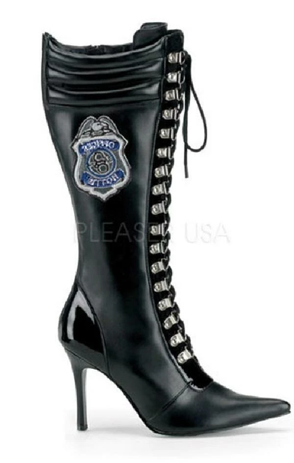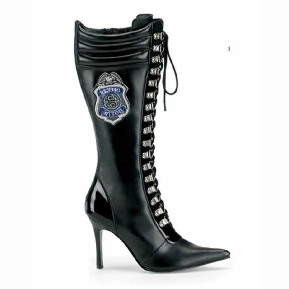 Black PU with black patent trim police inspired fancy dress costume boots. Be the sexiest officer on the force in these boots. They have a three and three quarter inch heel and a detachable clip badge and are ideal to complete all your Police or Military style fancy dress costumes