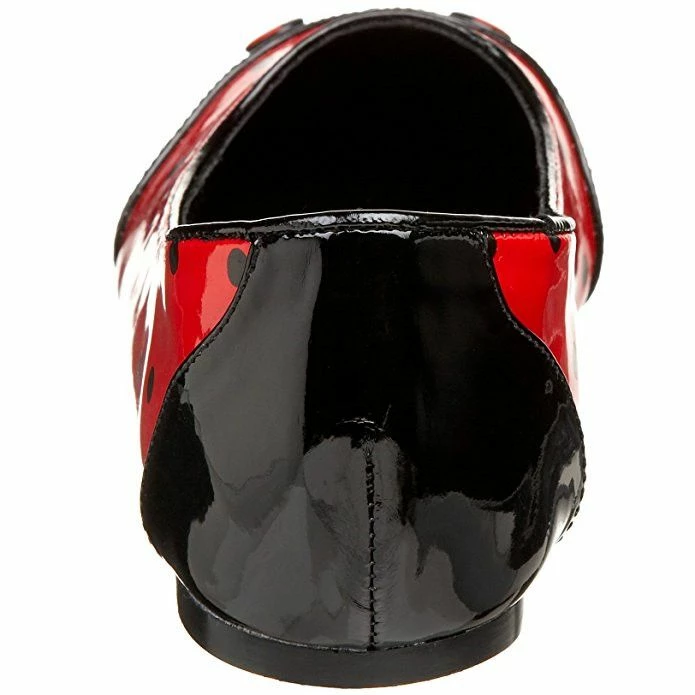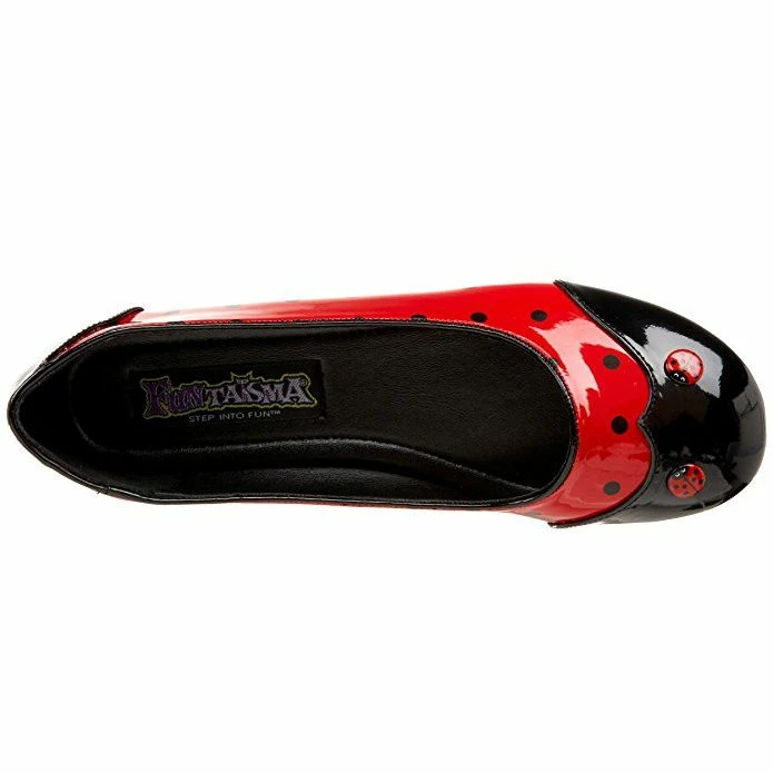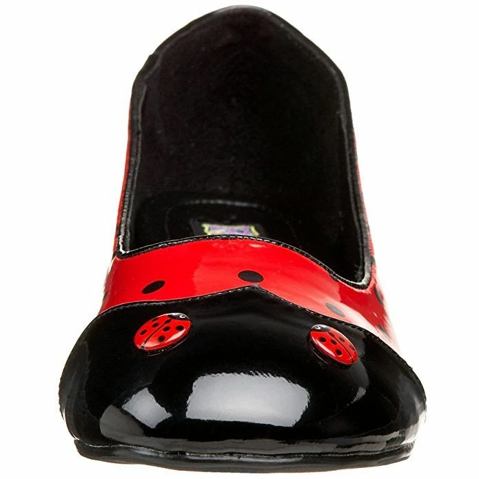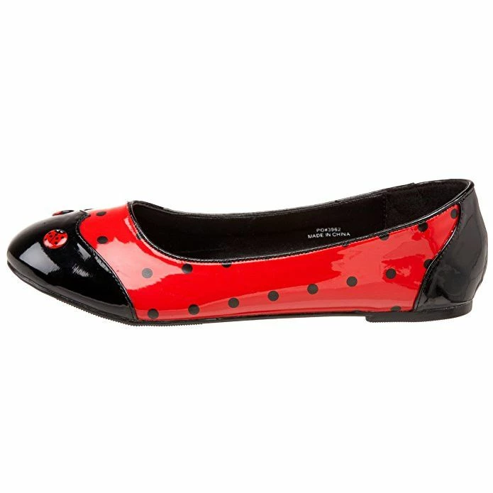 Black and red patent ladybird inspired fancy dress costume shoes. Highlight your attire with these unique ladybird fancy dress flat shoes by Pleaser. These flats are made with black and red patent on the exterior, finished with a round toe and eye-ball button accents and are ideal to complete all your lady bug style fancy dress costumes