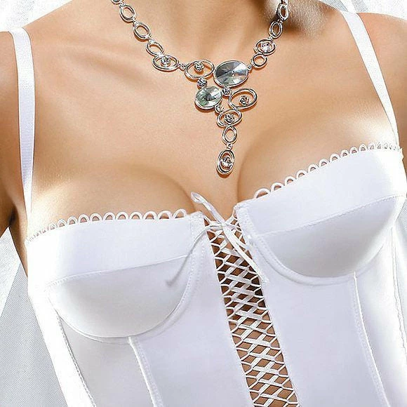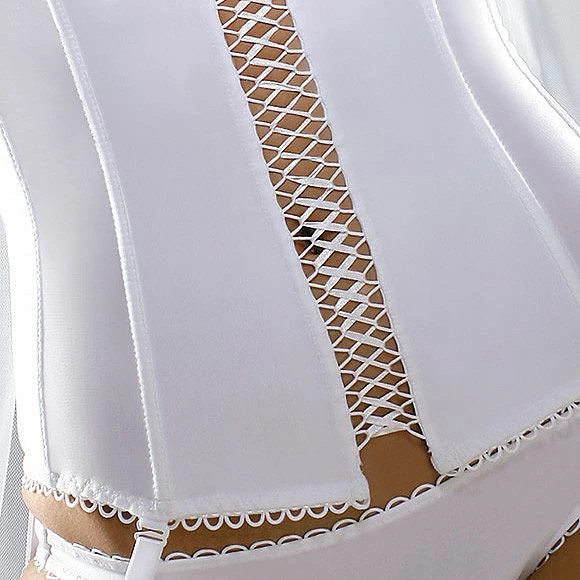 An ideal wedding bridal white corset which features the highest quality micro-fibre. Balconette cups with scalloped trim combined with the lace up ribbon tie front make this very classy! Hook and eye back closure, detachable suspenders and adjustable/removable shoulder straps.