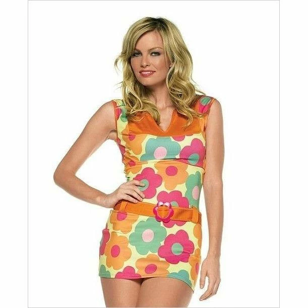 Daisy print retro costume dress by Leg Avenue. Costume includes a sheath dress and daisy buckle belt.
