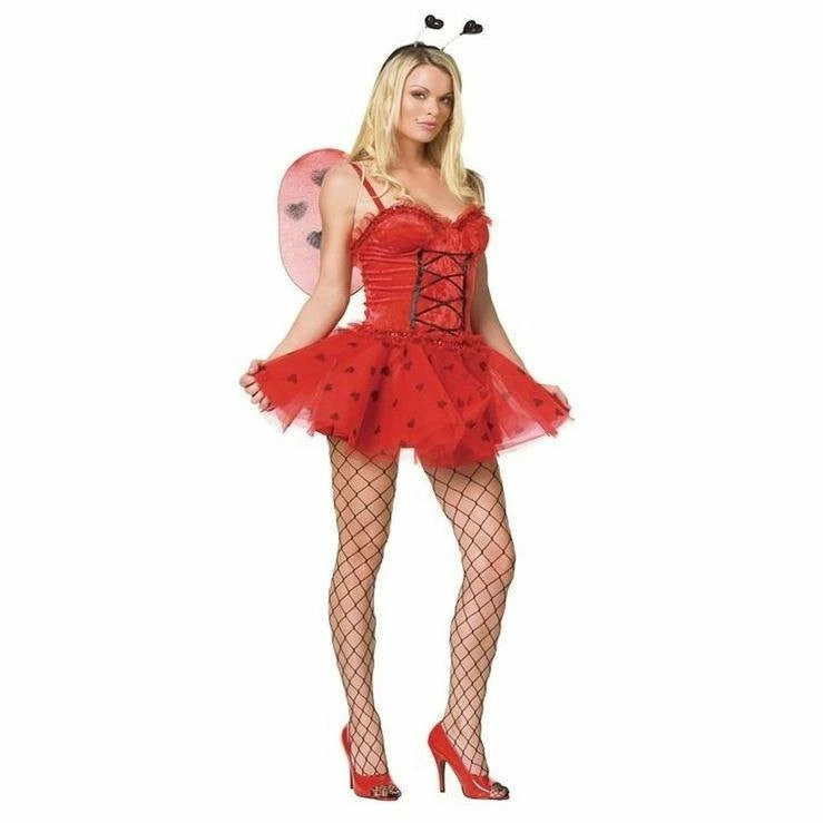 Lady Bug inspired fancy dress costume. This is a three piece costume which includes a red velvet and tulle dress, lady bird head piece and a pair of wings.