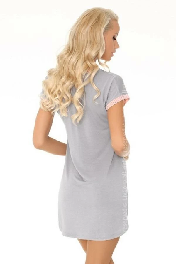 Captivating, light grey nightdress made of pleasant knitted fabric, mid-thigh length. V-neckline and short sleeves trimmed with a pink pleat with grey dots.