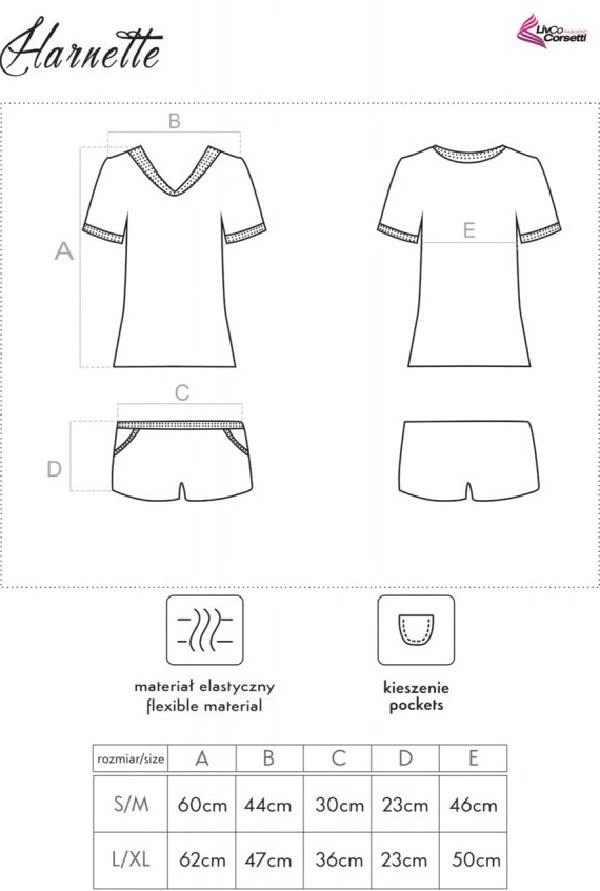 Comfortable pyjamas in a light grey colour, made of a pleasant knit. A blouse with short sleeves and a V-neck decorated with a wide pink pleat with small dots. Shorts with pockets trimmed with a pleat.