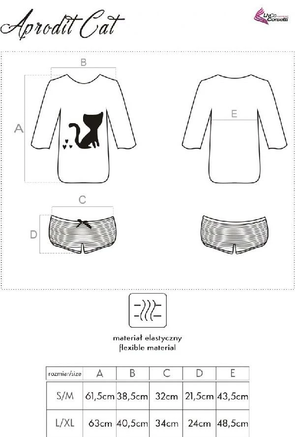 Cute pyjama set including a long sleeved top and shorts. The pink top, features a picture of a cat in black. To complete the set are navy and white striped shorts.
