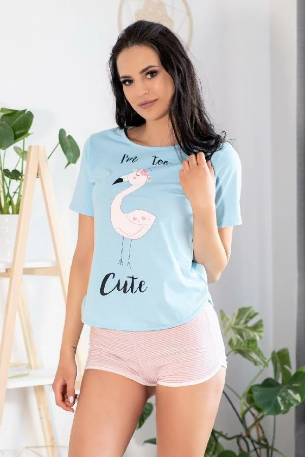 Cute pyjama set including a short sleeved top and shorts. The blue top, features a picture of a flamingo in pastel colours, with the wording ‘I’m too Cute’ in black. To complete the set are pink and white striped shorts.