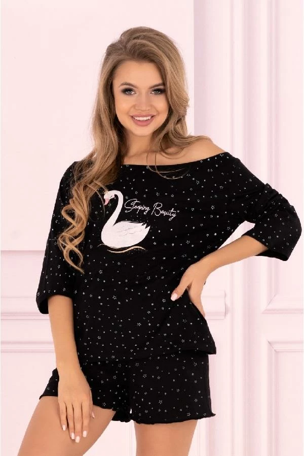 Cute pyjama set including a long sleeved top and shorts. The black top, features a picture of a swan in black. To complete the set are matching shorts the overall pattern on pyjamas are stars