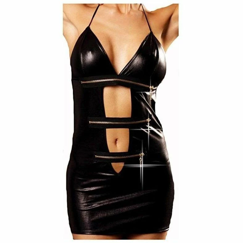 This dress is a halter tie neck and back and has three gold tone zippers add spice.