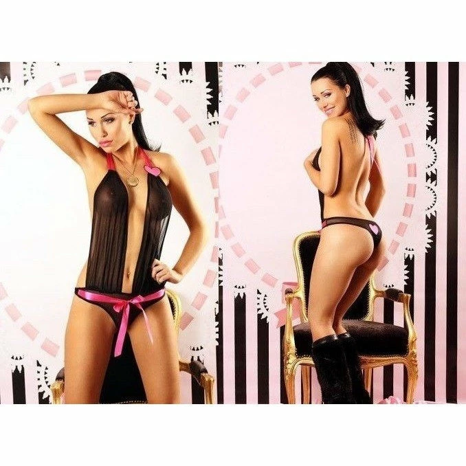 Innocent combination of black with harsh pink gives it a seductive look. It is made of soft, elastic material which perfectly adjusts to the female shapes. A decorative element are characteristic pink hearts on one of the shoulder straps and at the panties back. It is tied around the neck and in the middle, with a pink, satin ribbon.