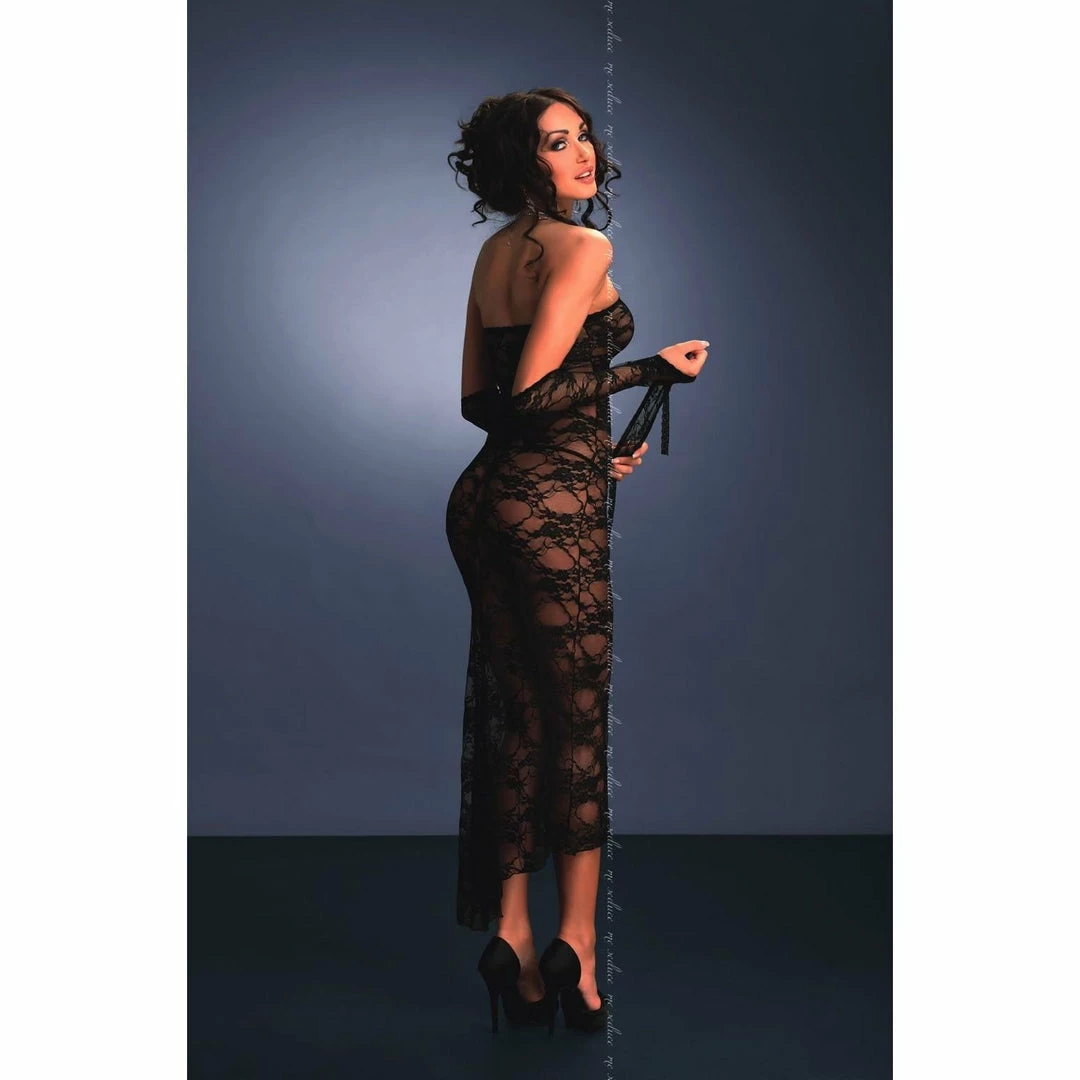 Black long lace lingerie nightdress with gloves, mask and thong made in Poland by Me-Seduce. This nightdress is made from lovely stretch lace, strapless long chemise set with asymmetric hem line. This nightdress comes as a set and also includes the matching lace gloves, mask and thong.