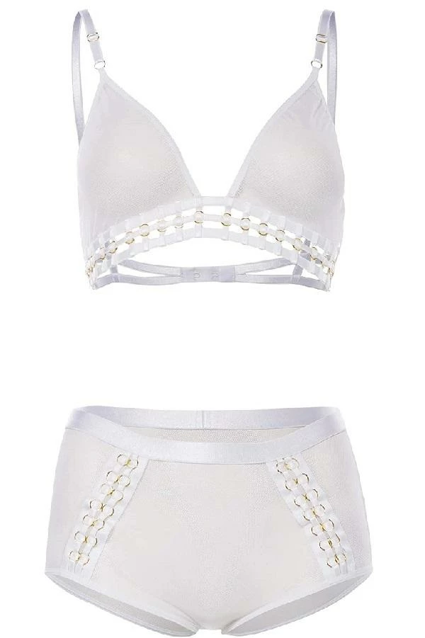 This is a tempting two piece set from the Gold & I collection made by Me Seduce Poland. It includes a bra and high waist brief which are both decorated with see-through mesh and have a tempting braided ring feature. The briefs have an elasticated waistband and there is also a plain mesh on the back just like the front. The back of the bra has one adjustable hook. Available in black red and white.