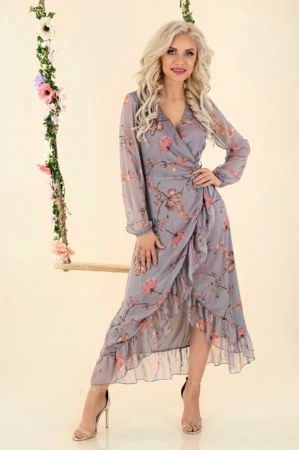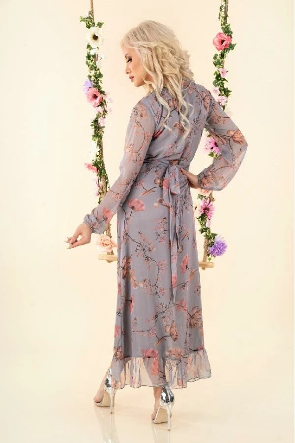 Long sleeved chiffon dress grey with pink flower detail. Glamorous dress which can be worn to all occasions