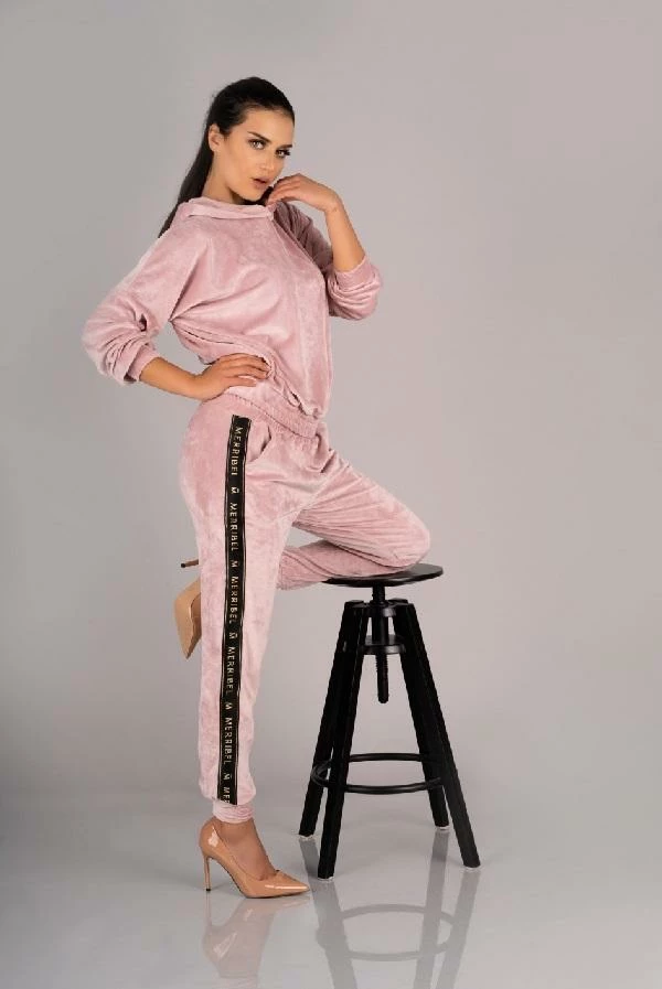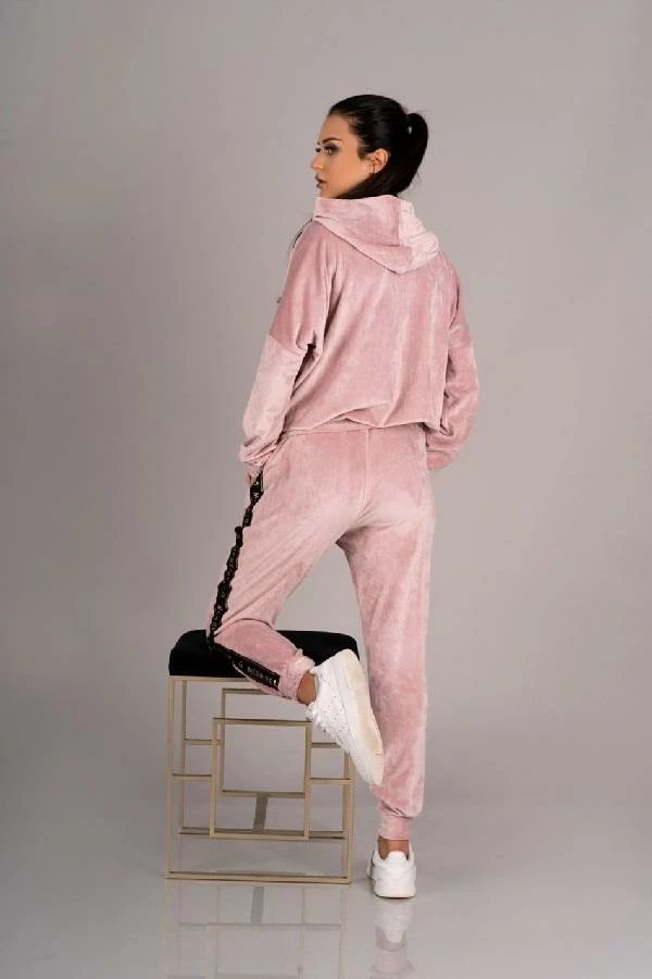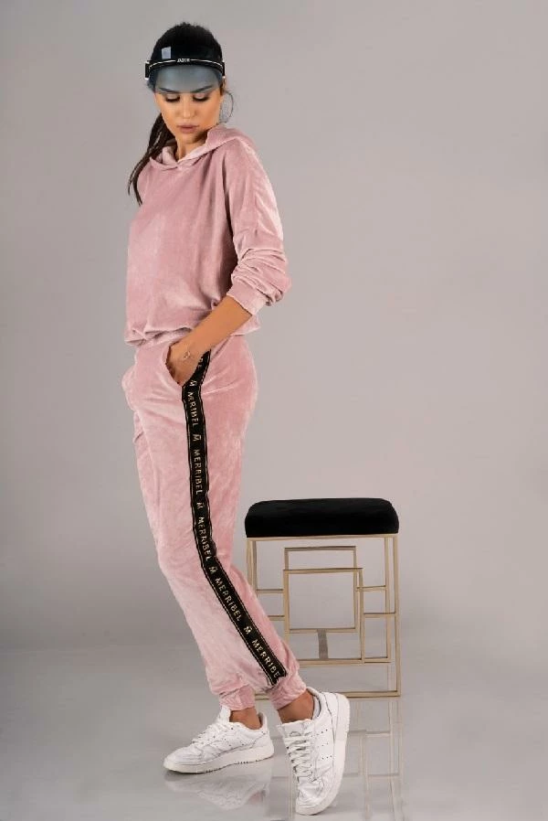 Comfortable pink velour tracksuit. This tracksuit consists of a hood top with matching bottoms with the designer logo on legs Merribel. This tracksuit is comes in red, tan and pink