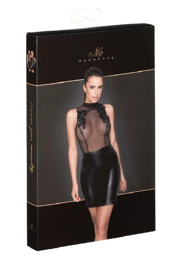 Sleeveless dress with elegant embroidery and playful decorative seams. The upper part is made of soft tulle and has a charming back neckline, where it is closed with two small buttons. The skirt is made out of outstanding stretchy Power wet-look and features a small slit on the back.