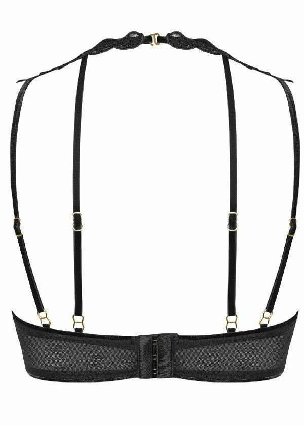 Gorgeous plunge underwired bra made from elegant transparent soft mesh. Additional halter neck embroidered straps makes it a real piece of art. Perfect for special ocassions or intimate evening in your bedroom. Hook & eye fastening.