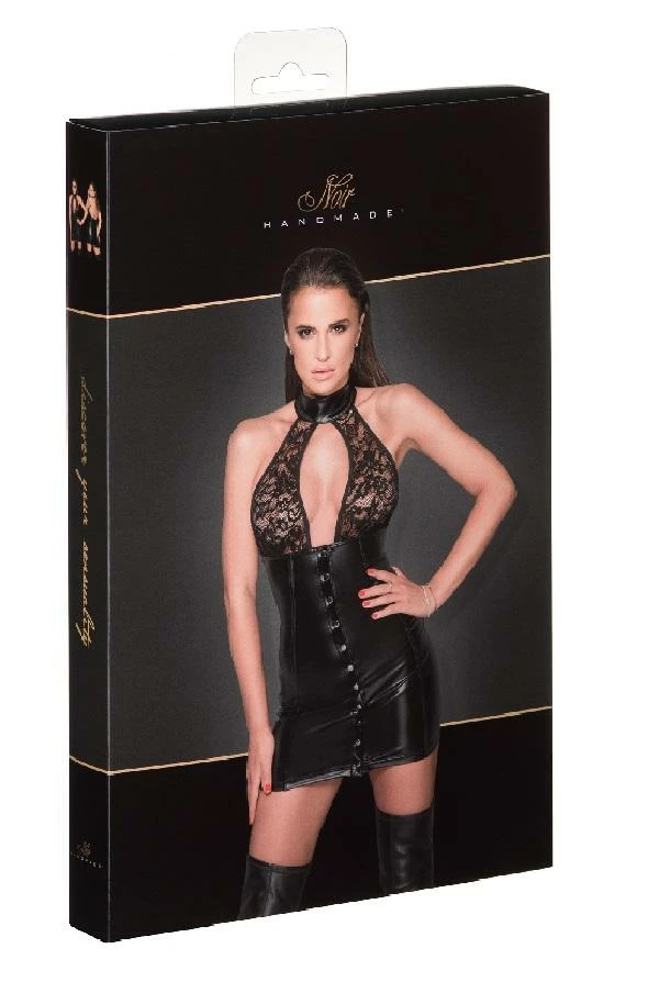 Adorable short dress made out of Power wet-look with a continuous button placket and a bra made of soft lace. The dress features a closure on the Power wet-look collar with a comfortable hook fastener.