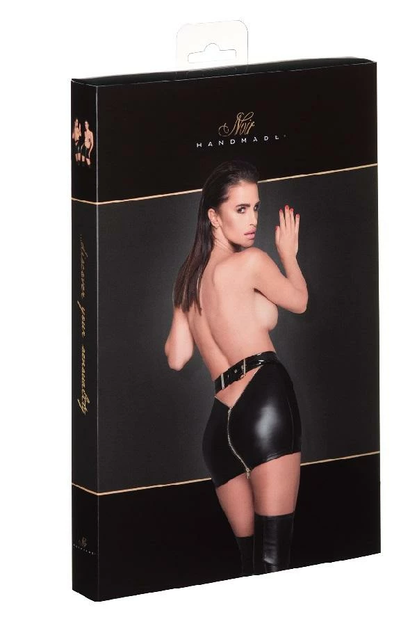 Fancy skirt with golden zippers on the front and back and adjustable PVC waistband (in three sizes). The back zipper ends just above the buttocks fold, making the skirt an erotic eyecatcher.