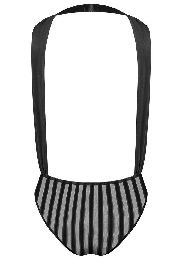 Seductive silky chiffon body with deep plunging V-neckline and crossover velvet elastic tapes to accentuate the waist. Chic, striped semi-opaque bottom is open in a very discreet way.