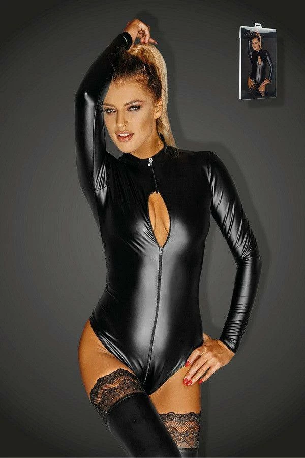 Wet-look lingerie Body handmade in Poland by Noir Handmade lingerie. This is a super sexy long sleeved wet-look body with a thong back. This body features a 3-way zip.