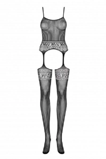Passionate and seductive black body stocking decorated with vertical stripes that makes the body slimmer and legs longer! The top of the stockings completed with geometric and floral motif also duplicated at the bottom of the top. One-piece set looks like two-pieces model! Sexy stripes emphasize the bust area.