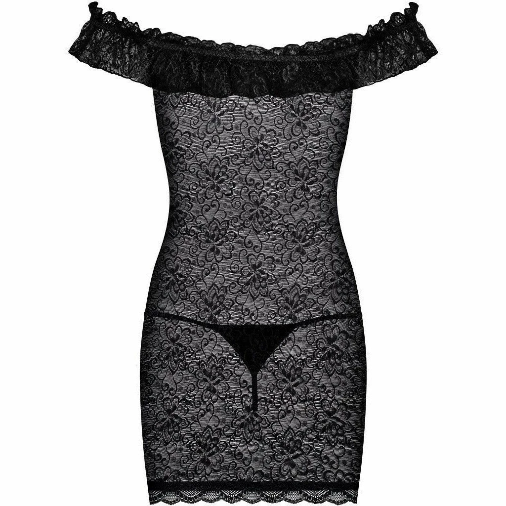 Provocative lingerie black chemise nightdress which is made of soft, sheer and glistened fabric. It fits the body snugly. A specific decoration-metal studded with glittering stones is situated between cups. Straps are made of frill can be wore lowered on arms. Matching white lingerie thong panty is also included. Attention – every metal element used in Obsessive products is carefully selected. They do not stain, are break resistant and nickel free, studded with the highest quality stones.