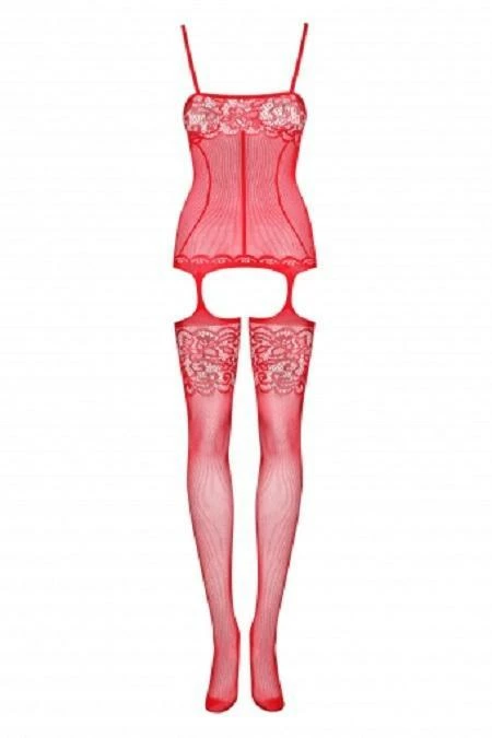 This is a sexy combination of a top and stockings. Red fishnet covers the body in a very sexy way. Beautiful floral patterns on the left leg and on the top. Vertical straps slenderize the body. A spicy cut expose thighs and buttocks.