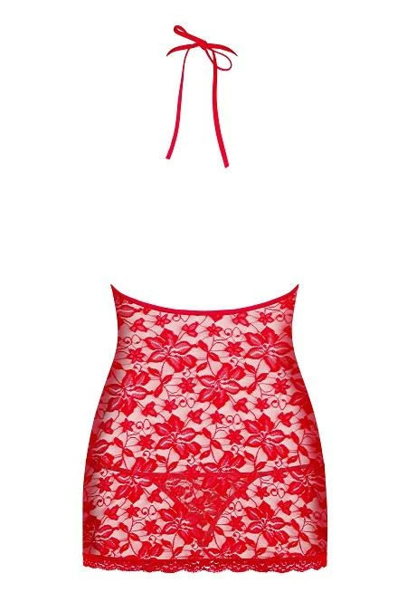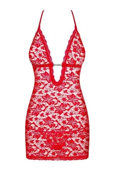 Sensual lacy red chemise nightdress with floral pattern for hot evenings. Cups, deep décolletage and bottom part edges made of soft ornamental lace. Decorative stone belts connecting cups emphasize bust in an amazing way. Thin straps are tying up at the neck revealing tempting open back. Matching thong included.