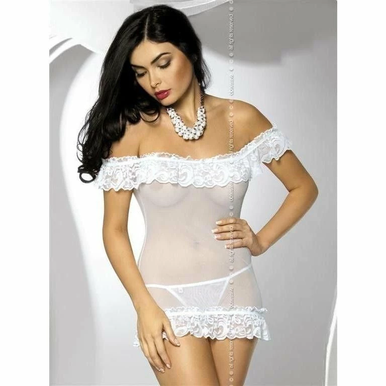 Sexy off the shoulders chemise baby doll nightdress. Charming white chemise made of elastic mesh, exposes woman’s body in tempting way thanks to the tight fitting and sheerness. Upper and bottom part of it is trimmed with soft lace frill; it can be worn lowered on shoulders. Matching thong panty is also included.