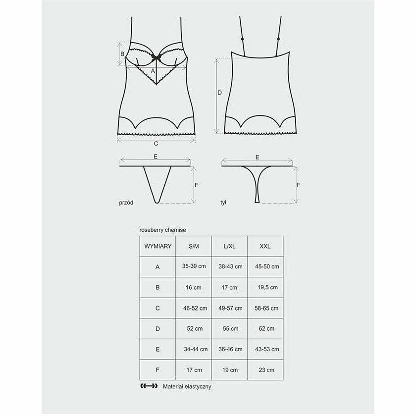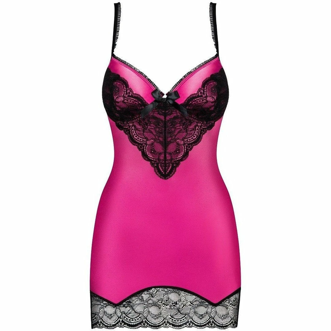 Tempting chemise – the quintessence of seduction! This chemise nightdress is made of shiny satin in deep fuchsia colour and has under-wired cups and the end of the chemise decorated is lace with a floral motif lace and has regulated straps – the guarantee of perfect fit the straps of the nightdress is decorated with frivolous frill. A matching thong panty is also included