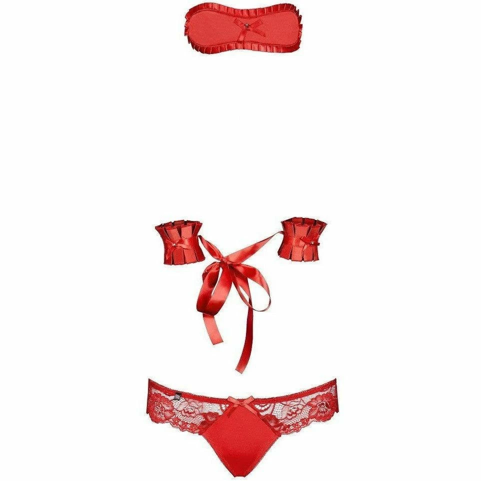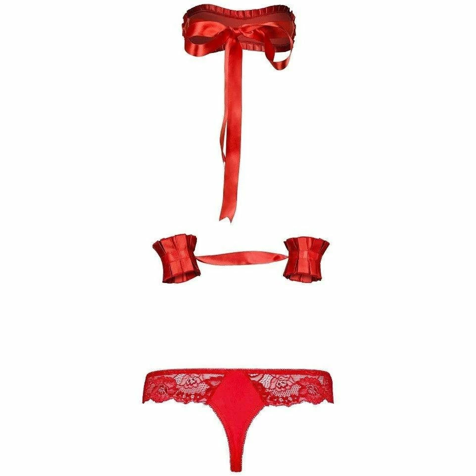 Seductive three-piece lingerie set, let it will take over the control! This lingerie set is made from shiny, red satin eye-band laced in the back with a soft ribbon, satin handcuffs fastened with Velcro connected with a ribbon and a thong decorated with a lace around the hips emphases your curves