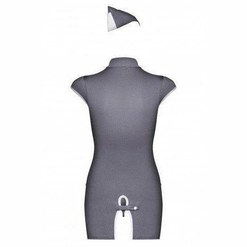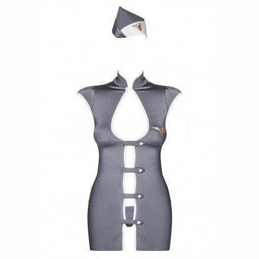 Seductive Air Line inspired costume of one of the sexiest professions in the world! The dress beautifully covers the body with tempting openings on the belly and low neckline emphases the bust and a combination of a high collar and short sleeves with the imitation of epaulet adds a uniform character. The cut out at the back frivolously shows the body curves and the cap decorated with the sign of „Obsessive service”. The amazing thong and cap included