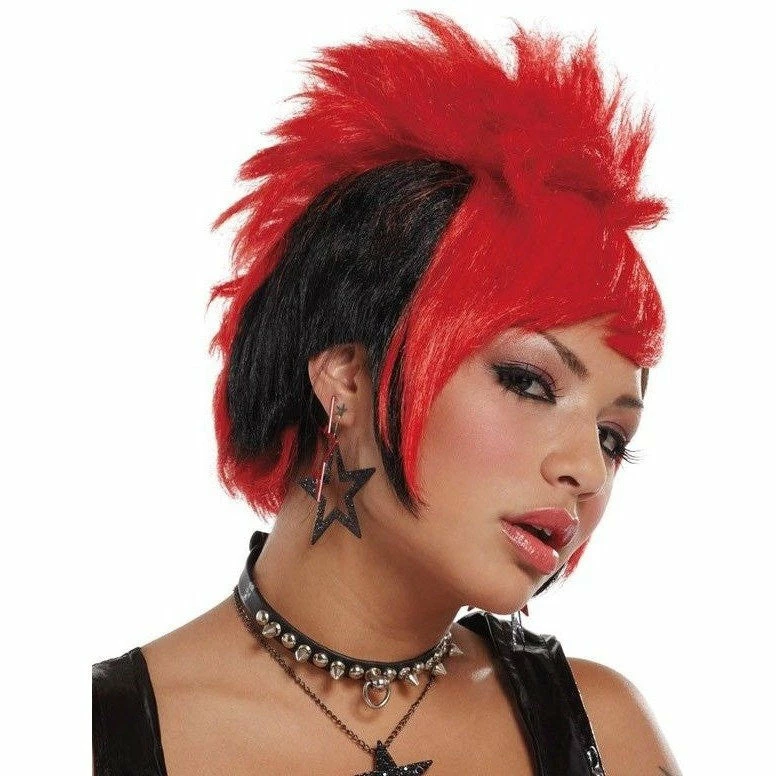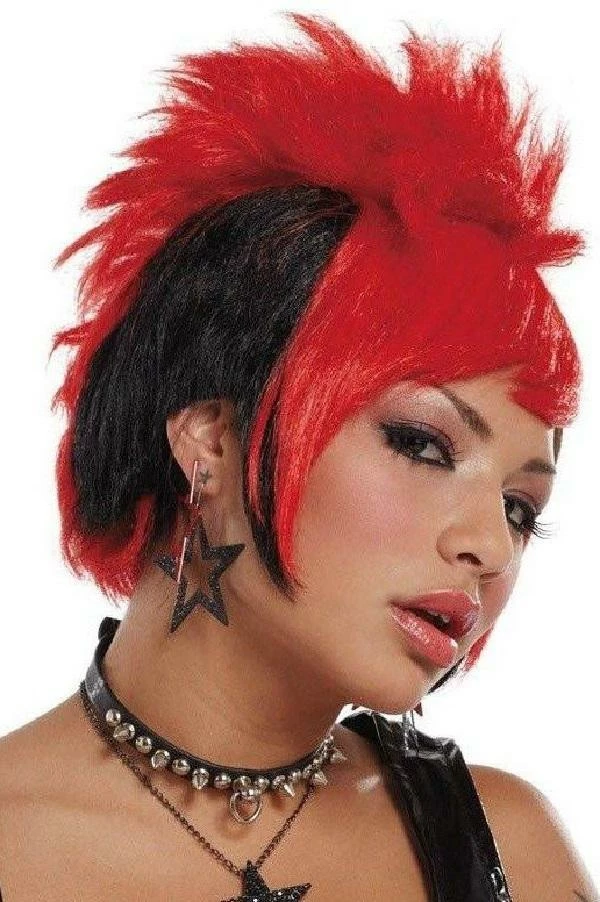 Stylish punky girl wig. This a short, red and black with spikes.This wig is also available in a black and blue