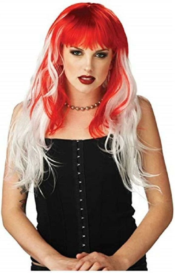 Long red and white costume wig to complete all your fancy dress costumes. This wig is also available in black and red.