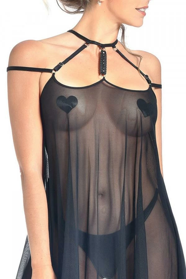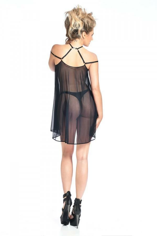 The sublime of this nightdress will let your bust unfold nicely thanks to its transparent mesh fabric. American armholes are made with adjustable straps. Furthermore two thongs fall on the shoulders. The dress is available in two colours, black and white. The model is wearing size T 2.