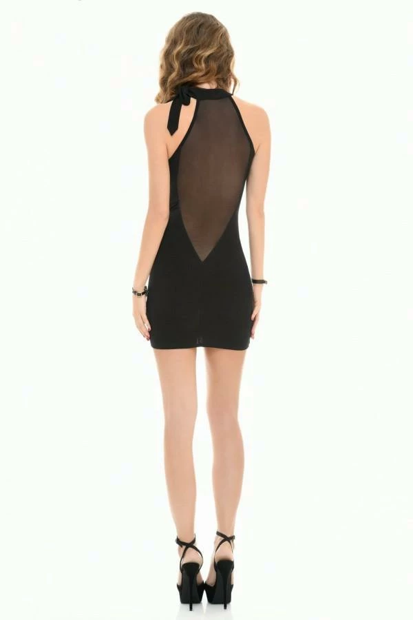 Black sleeveless dress, has a beautiful deep neckline on the front and back. It is made of transparent mesh for a very attractive look. The American armhole dress closes at the side of the neck by a knot that falls on the shoulder. Lycra and mesh fabrics are stretchable and comfortable, they will adapt to your silhouette.