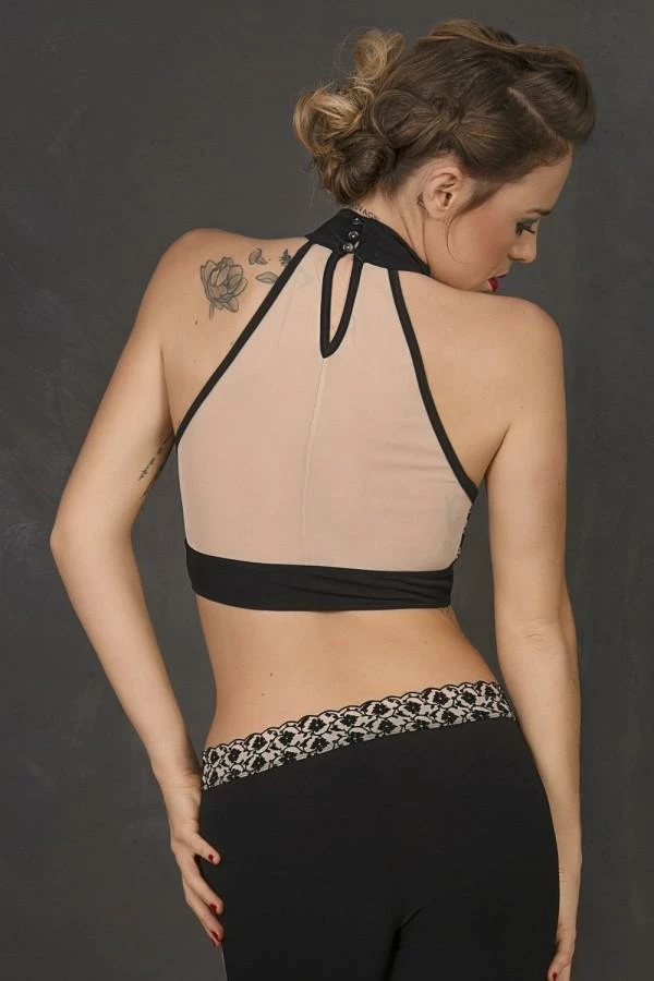 Delicious black crop top at the front and flesh-coloured at the back. Pretty transparency on the neckline. American armholes that highlight the shoulders. Wide band with floral pattern on the chest. A subtle blend of colours and materials that has its effect! The Clémence top is also available in a long version and co-ordinates perfectly with leggings also in this collection.