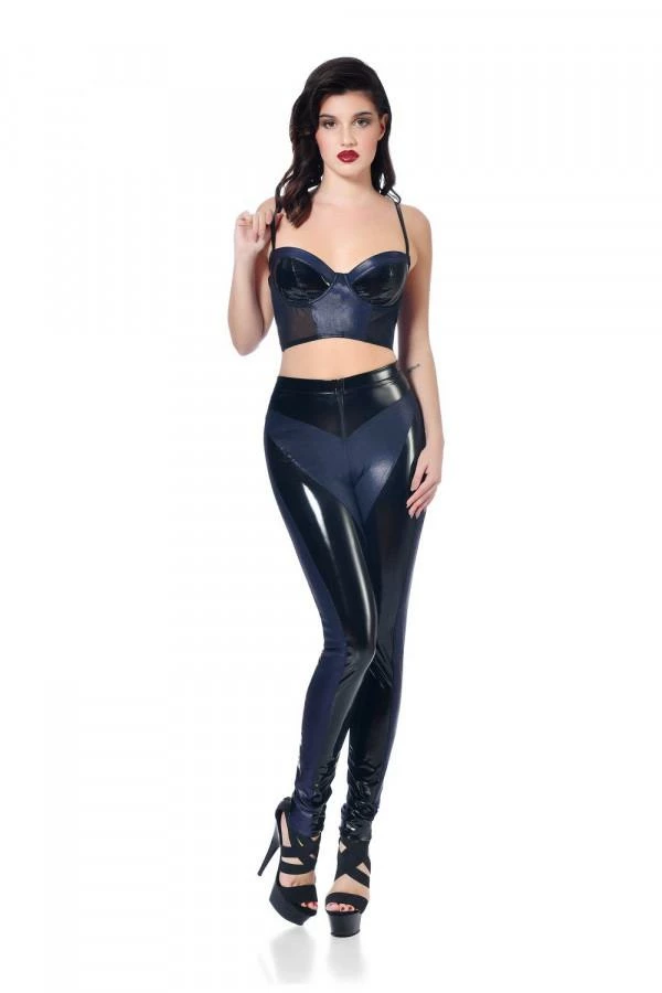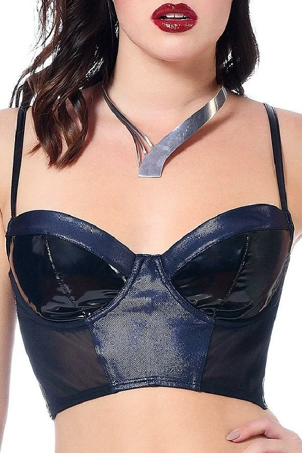 The Bridget bra is very original: made of vinyl, wet-look jeans and mesh.Â