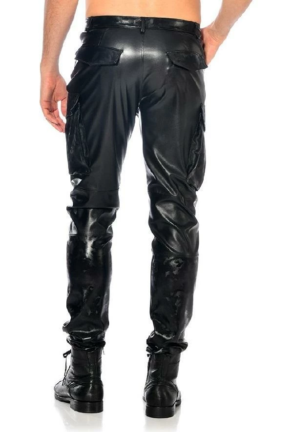 These are a solid faux leather cargo pants with side patch pockets and flap pockets on the back. The belt has passers-by. Wear it with Jayden shirt.