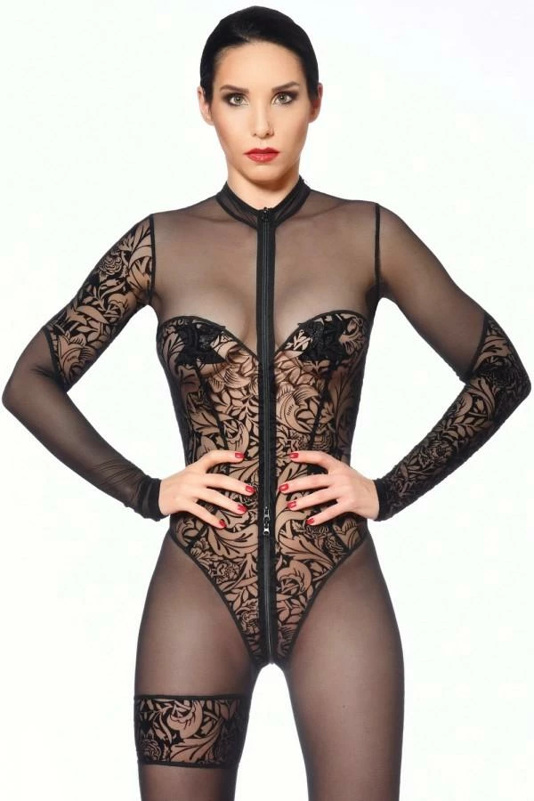 The Miria catsuit perfectly mixes two soft and supple meshes. The tattooed body effect will emphasize your body, and the recall on the arms and on one thigh will give the illusion of a completely fitting tattoo all over your body. You will find the 3-slider zippers revisited by Patrice Catanzaro. The mesh design is inspired by Maori tattoos.