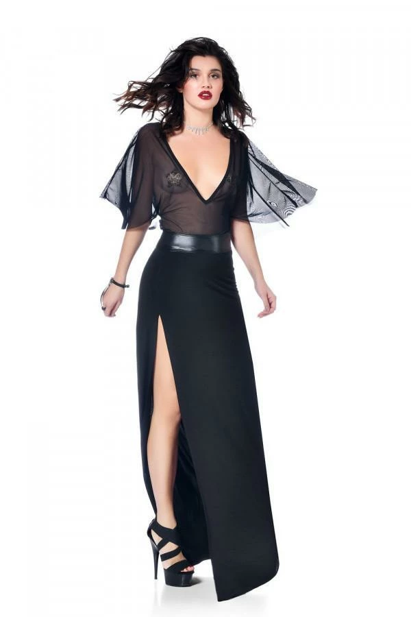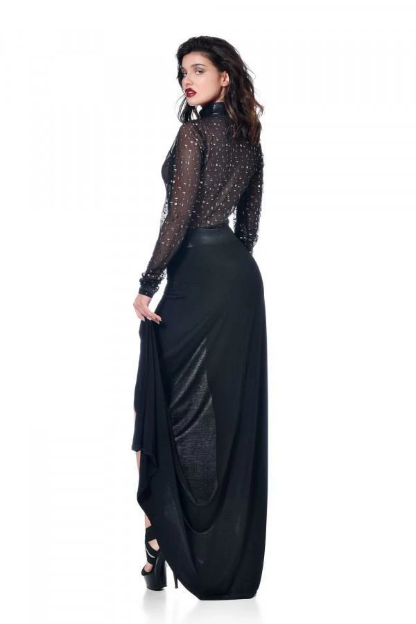 A beautiful long black Lycra skirt very easy to match. The skirt has an extensible wet-look band that will highlight your waist and your legs thanks to its opening on the left side. Wear it with the Saphir bodysuit or Topaze top.