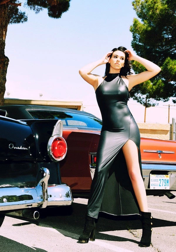 Backless wet look long dress with a high side slit made in France by Patrice Catanzaro.