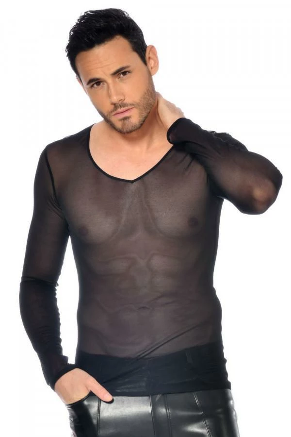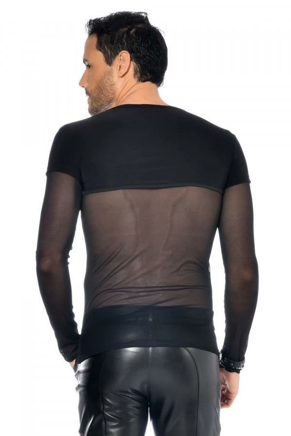 New men’s collection by Patrice Catanzaro! This is a long-sleeved mesh t-shirt. This piece is very easy to match. Wear it with the Joffrey bolero in Lycra or wet-look or the Joss trousers in faux leather also in this collection.
