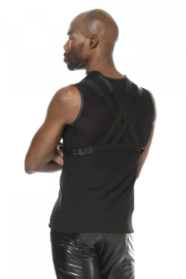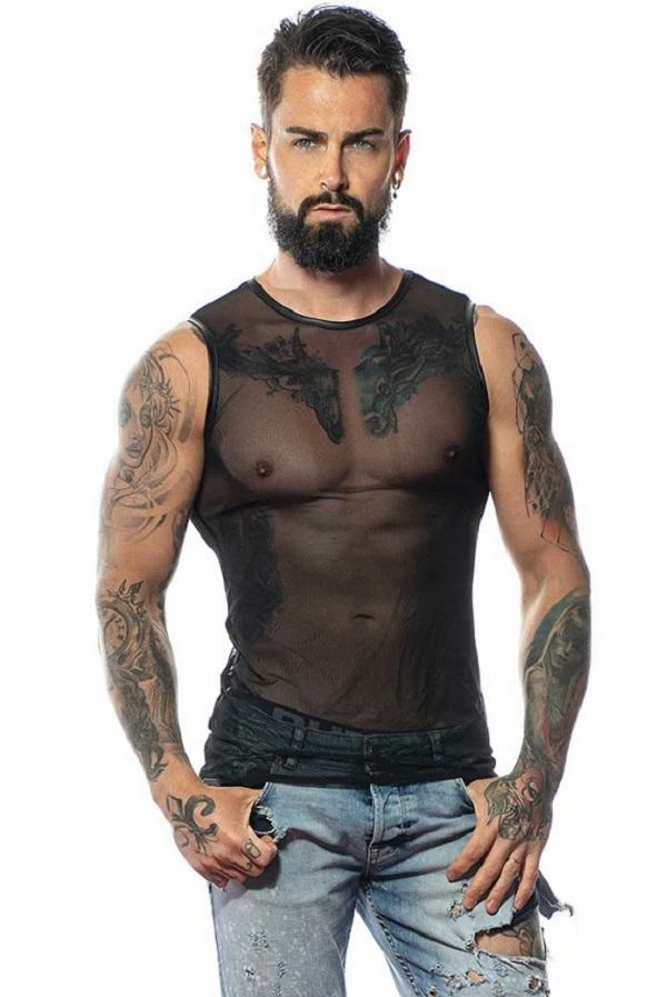 A very sexy tank top for men in transparent black mesh. Slim fit, sleeveless with a rounded neckline. The borders are in a black wet-look effect leather fabric. A tank to wear with or without harness which can also purchased on site and to coordinate with pants of the stylist .