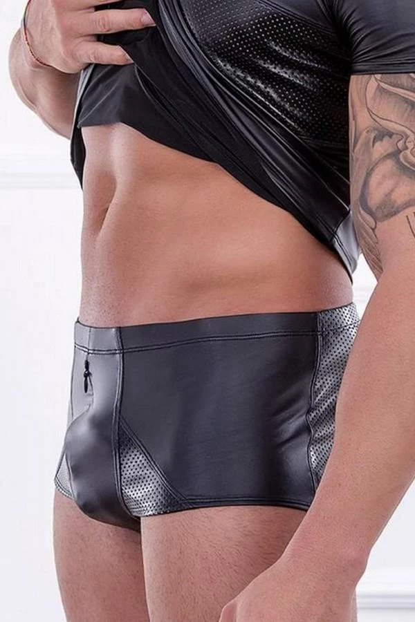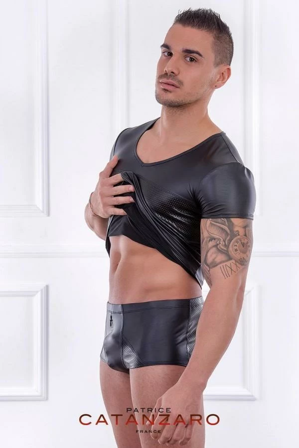 A sexy black boxer for men. Smooth black wet-look fabric and perforated leather effect fabric on the back as well as in detail on the front. Invisible opening zip. The boxer is presented with the perfectly coordinated Noam t-shirt.